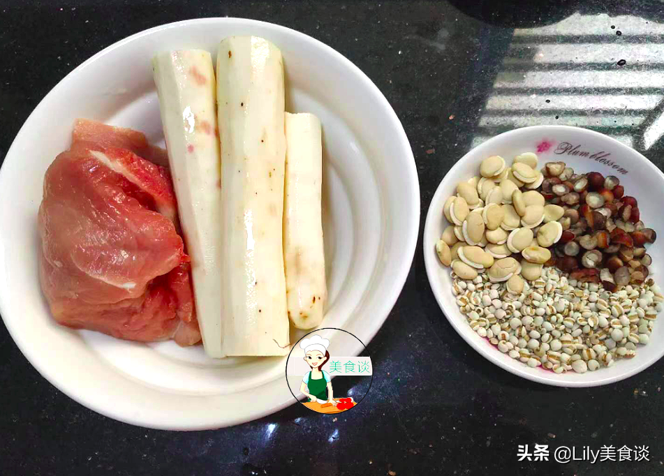 准备食材:瘦肉适量、山药适量、薏米适量、芡实20克、白扁豆20克、生姜适量。