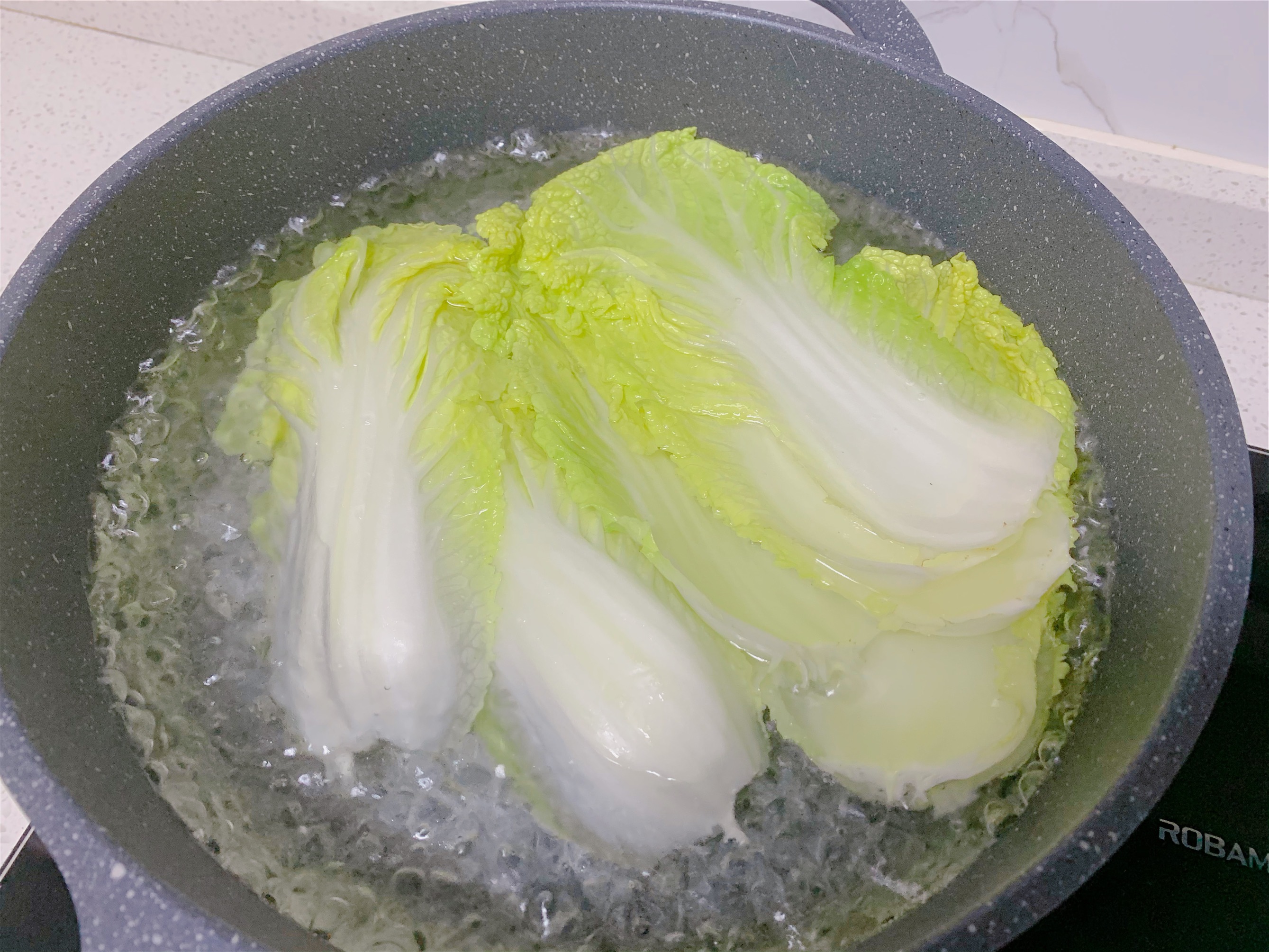 3、 锅中注入清水,大火煮开,加入一勺油和盐,加入大白菜,煮3分钟左右,煮至变软,加起来杆子弯曲即可夹出放凉。