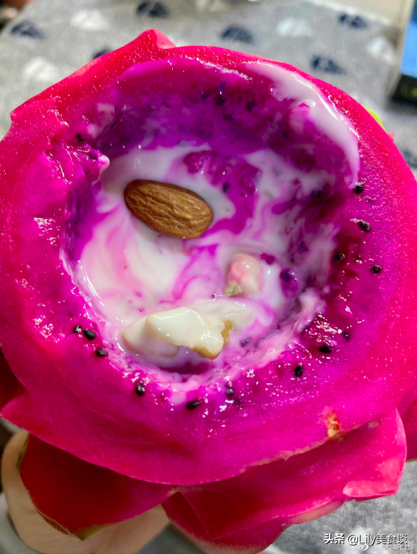 这款红心火龙果捞酸奶做法也是非常简单的,常见的就是把火龙果扒拉出来,切成小块装入碗里,然后倒入酸奶、坚果啥的一切拌匀了吃,关晓彤分享的这个做法就更“高级”了,简直是懒人的福利呢,直接把火龙果对半切开,用勺子挖果肉,倒入酸奶和坚果一起,做成火龙果盅,也是很别致呢,这个吃法小编一定要试试。