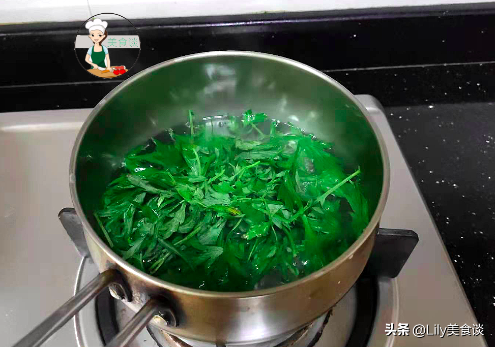 1、锅里水煮开加入一勺盐放入洗净的艾叶下锅焯水。