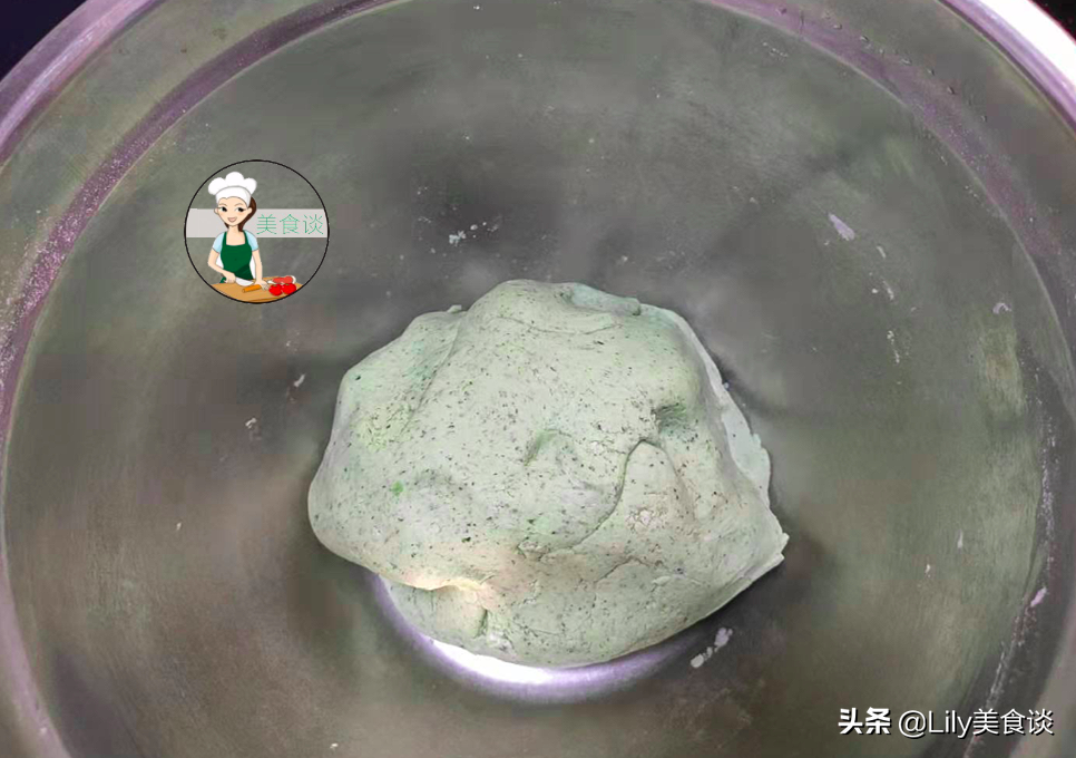 7、接着把艾草团和澄粉团混合揉均匀。(加入适量的澄粉做出来的青团口感软糯不粘牙,蒸的时候也不容易塌陷变形,好看又好吃哦)。