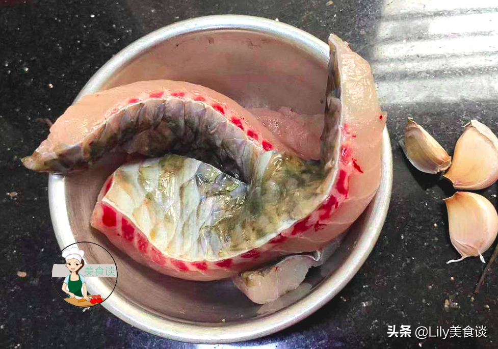 准备食材:去骨鱼肉适量、大蒜适量、葱适量、生姜适量。