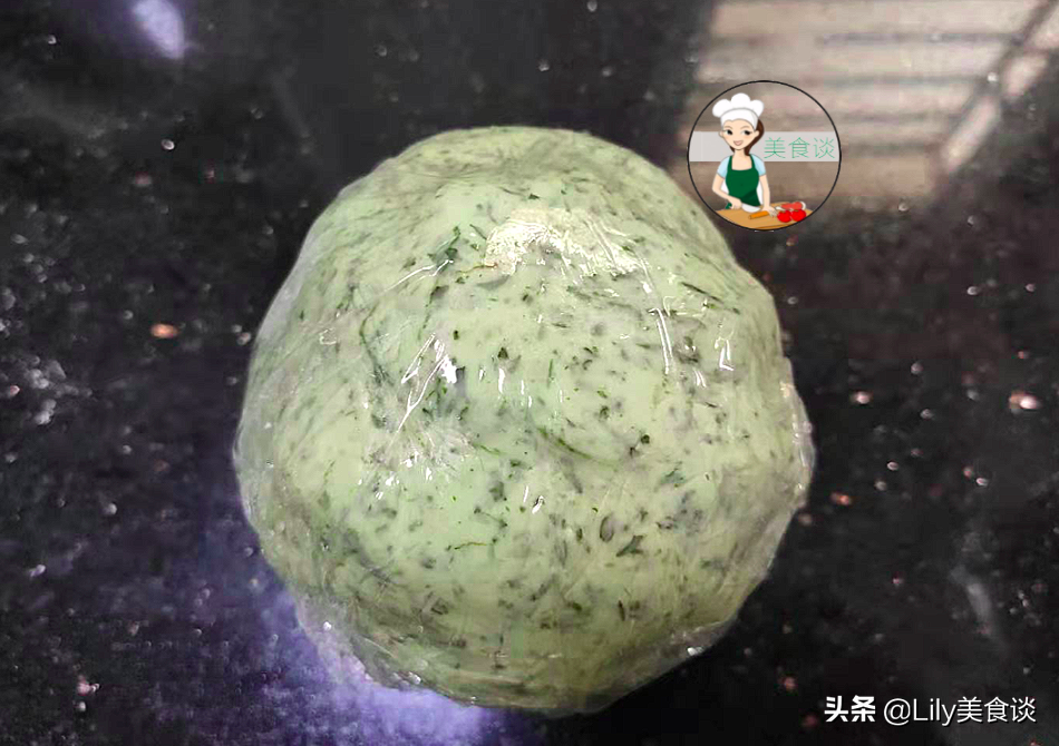 7、将揉好的艾草面团,盖上保鲜膜备用。