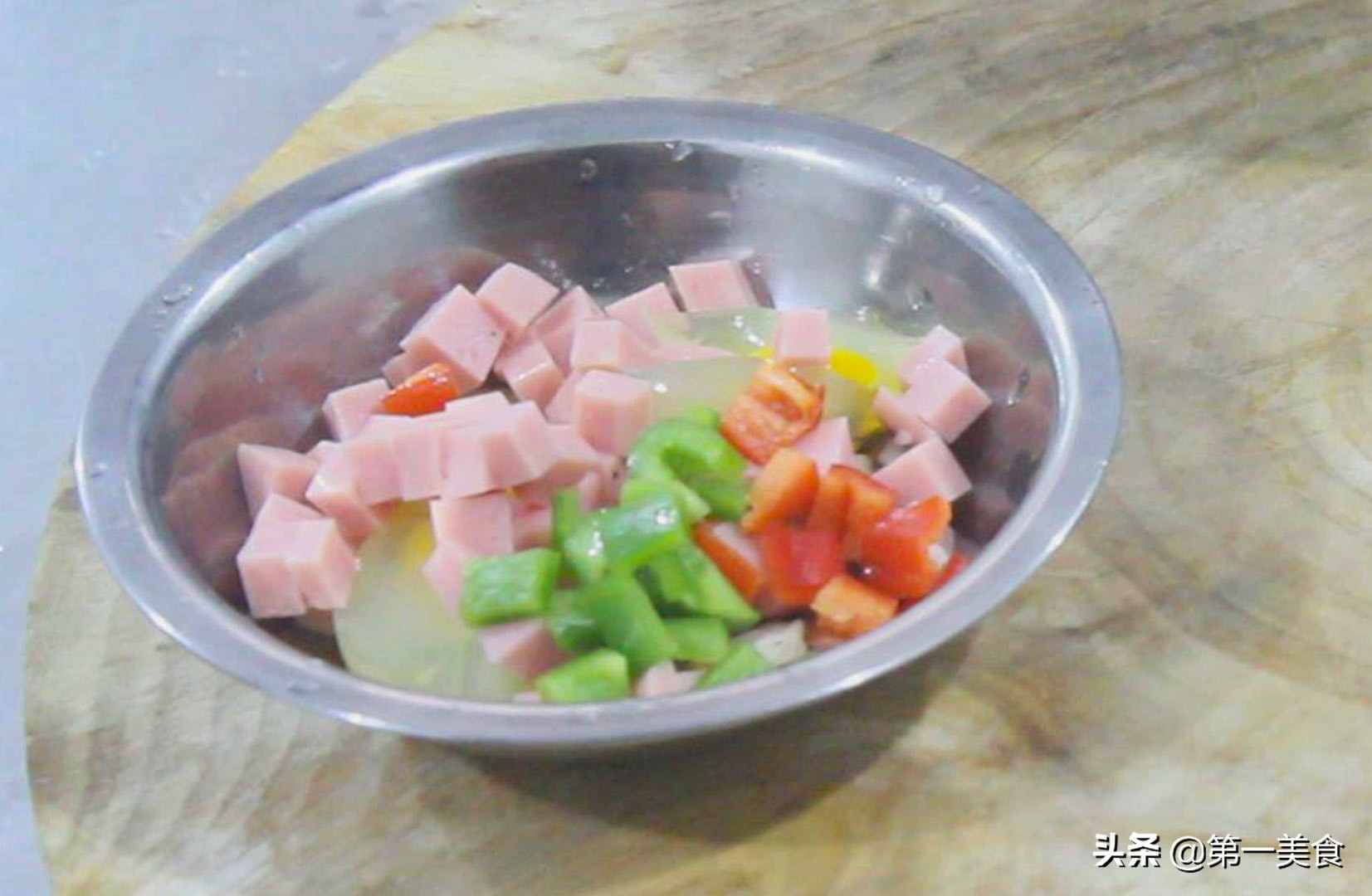 第二步:香菇用水焯一下,切成粒,变蛋切成小瓣,火腿两半切成粒,青红、椒切成粒,一起放在盆里备用。