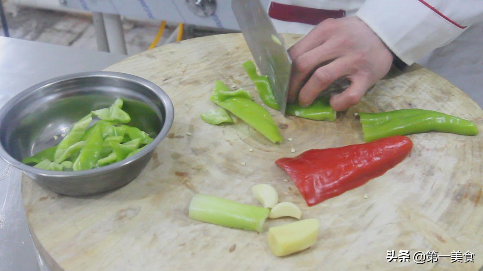 第一步:青椒一个,切成菱形片,红椒小半个(主要用于配色),葱、姜、蒜切片。