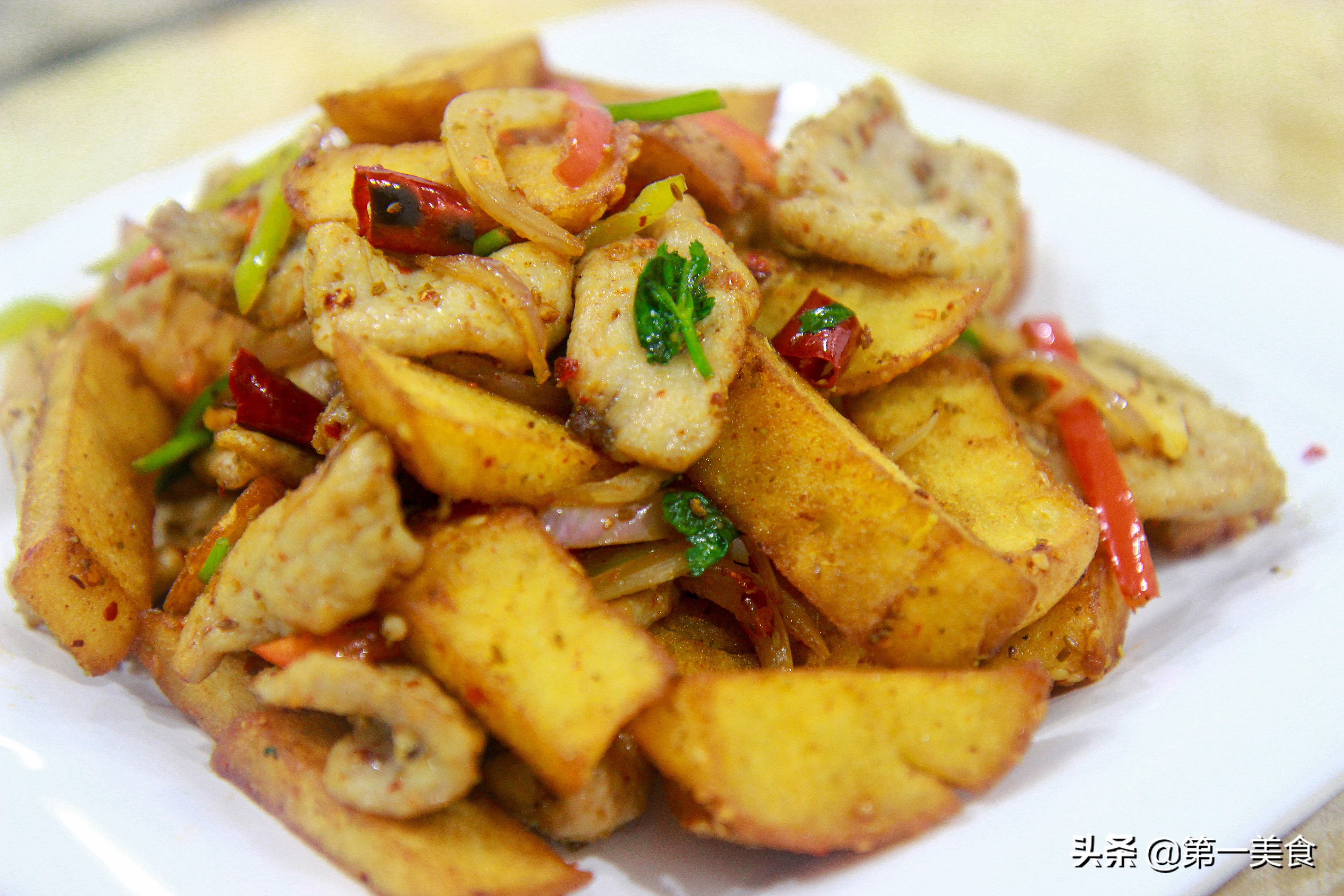 第六步:炒馍,锅中留油,倒入切好的配菜和红干椒,再加入食用盐,味精,白糖,鸡精,翻炒化开调料,倒入炸好的烧饼和里脊肉快速翻炒。
