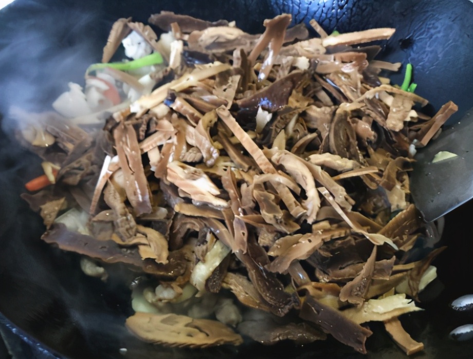 第四步,加上少许的白糖和料酒,翻炒均匀后,将笋丝放入,混炒,待炒至笋干的水分略微变干的时候,加上少许的食盐调味,再加上点生抽和老抽上色;