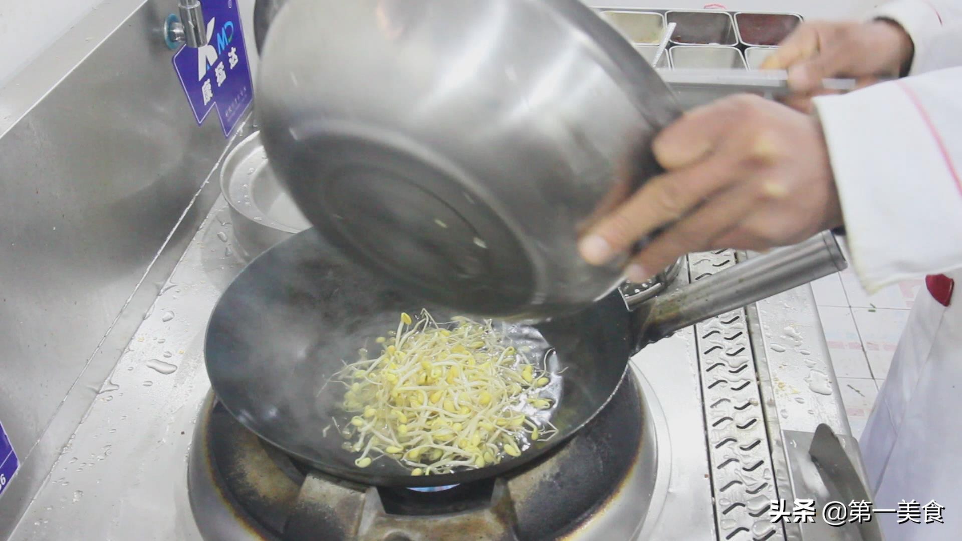 锅中加入清水,倒入准备好的豆芽,开始焯水,焯至断生,这一步的目的是为了去除豆芽的豆腥味,捞出控干水分。
