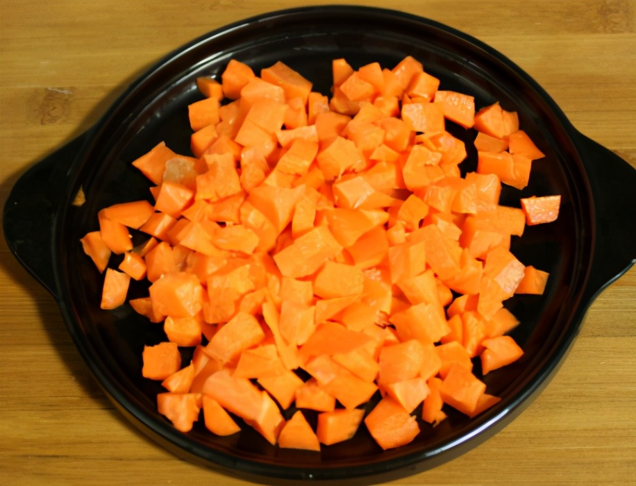 2、胡萝卜切成与玉米粒、胡萝卜丁一般的大小,这道菜看上去更加美观,这三样食材事先要焯下水,可减少炒菜的时间,更能保留鲜美的口感,焯水的时候加上点食盐和几滴食用油,可保留食材自身的颜色,而且口感也非常好;