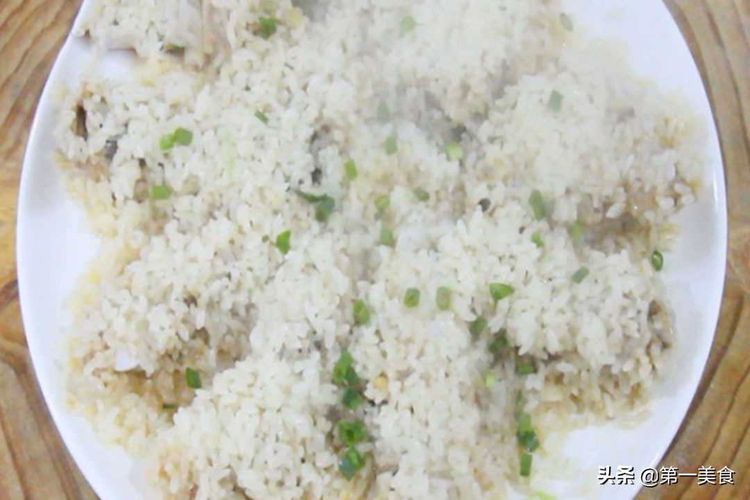 不均匀的地方用勺子把糯米铺开,最后把多余的糯米倒在盘子上。