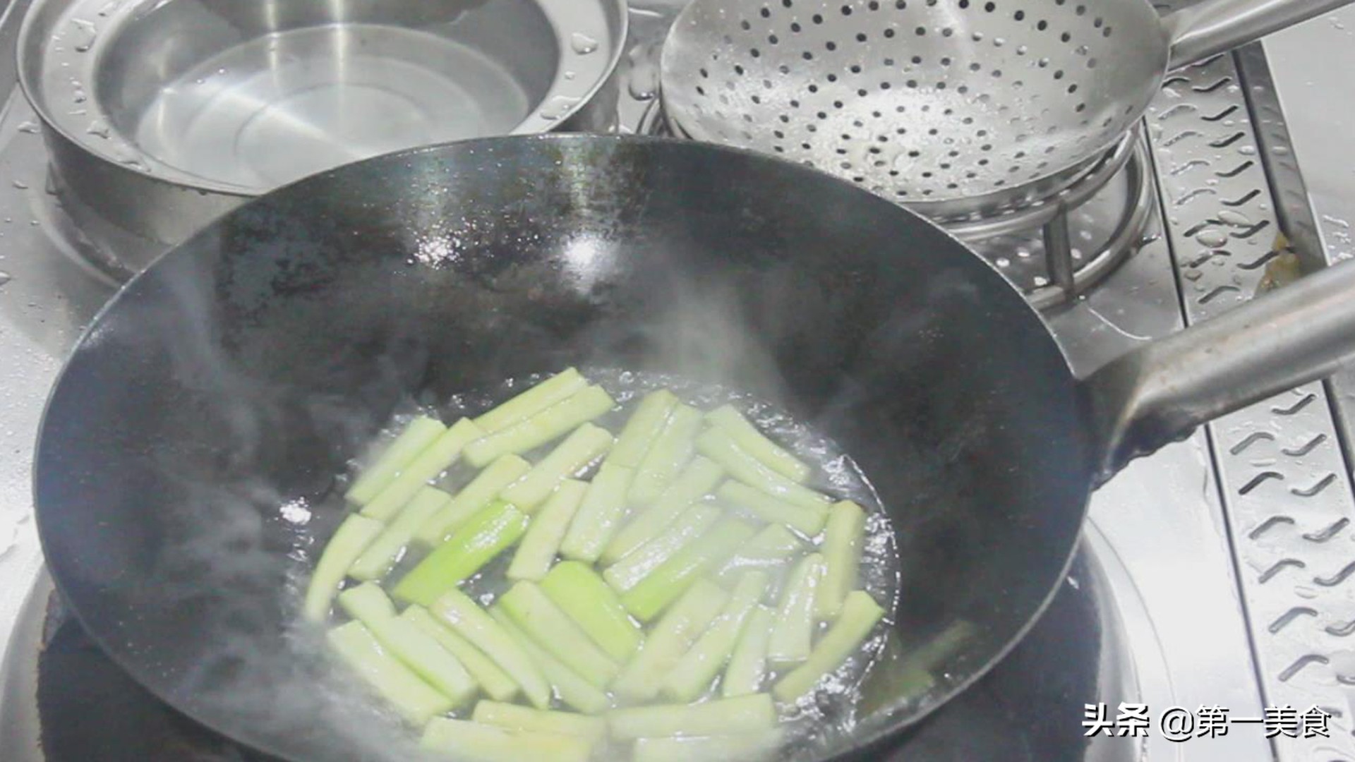 锅中烧水,水里加入植物油,水开之后倒入丝瓜条,焯水30秒倒出,水里加点植物油的目的,是焯过水的菜能色泽发亮。