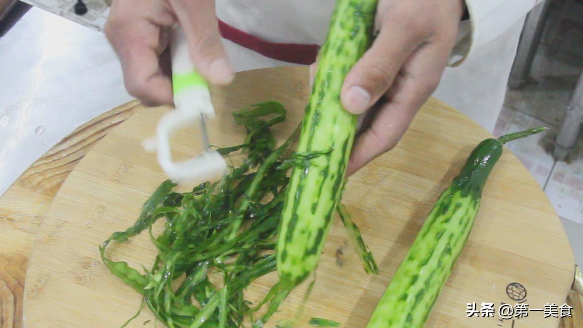 准备黄瓜两根,清洗干净,削皮,削皮时不用全部削干净,稍微留一点皮,会更美观。