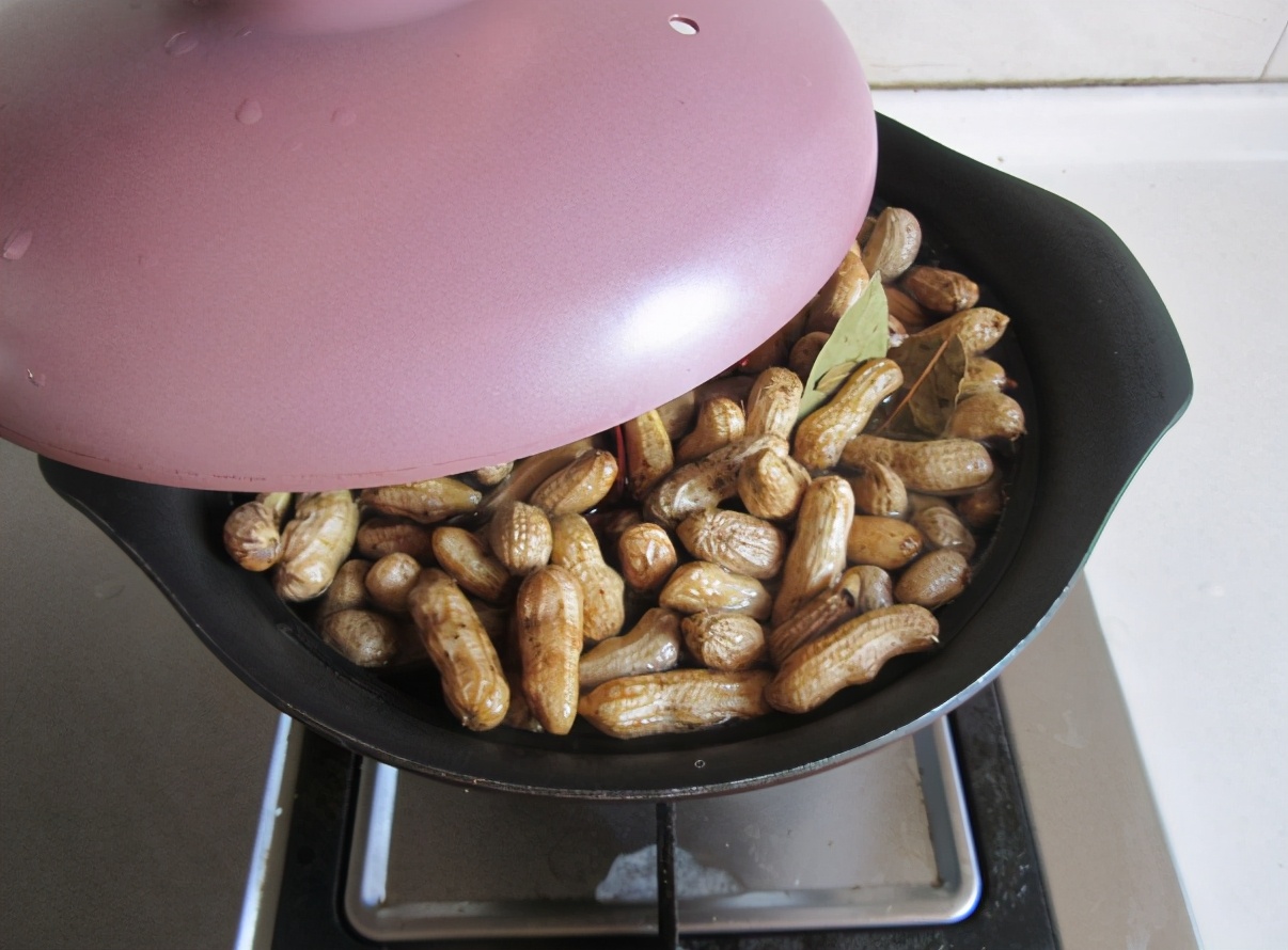 第三步、开大火加热,煮开后继续煮5分钟,关火后倒入花生,盖上盖子浸泡2小时。