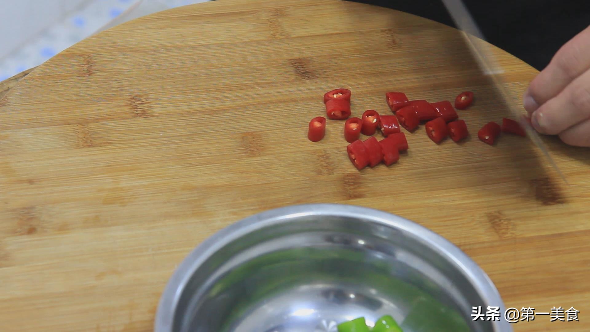 准备青线椒两个,红线椒一个,都切成辣椒圈备用。