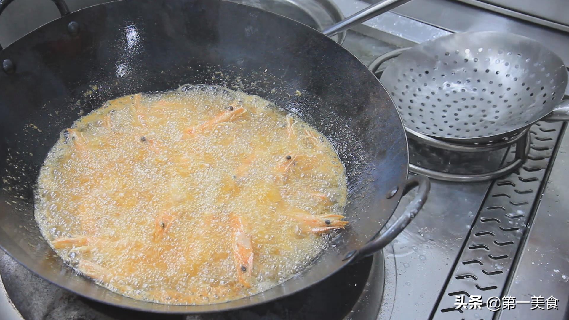 锅内烧油,油温五成热时,放入大虾,晃动炒锅,以免大虾粘锅,中小火炸制两分钟左右,等到大虾炸到金黄倒出控油备用。