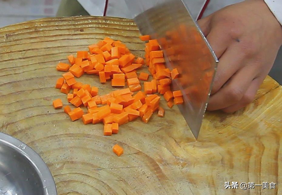 准备胡萝卜一个,也是先切片,再切丝,最后切成碎粒备用。