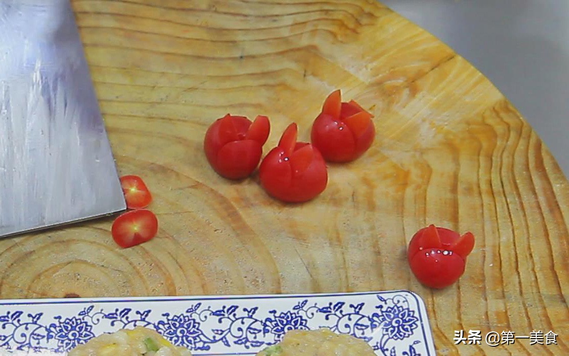 取几个圣女果,打花刀做成小兔耳朵,西蓝花用开水烫1分钟,摆在盘中点缀然后,再把肉饼摆在盘中。