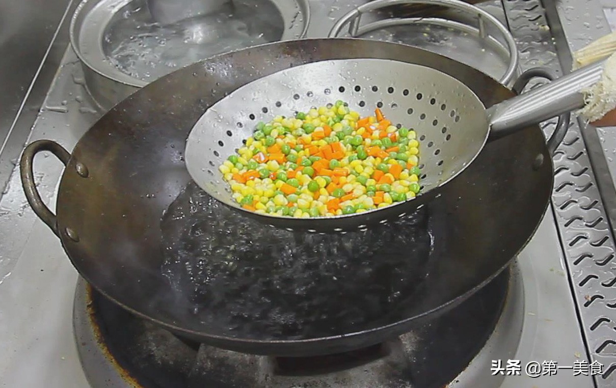 锅内烧开水,水快烧开时,把胡萝卜粒,玉米粒,青豆焯水2分钟,捞出后用凉水冲洗,控干水分。