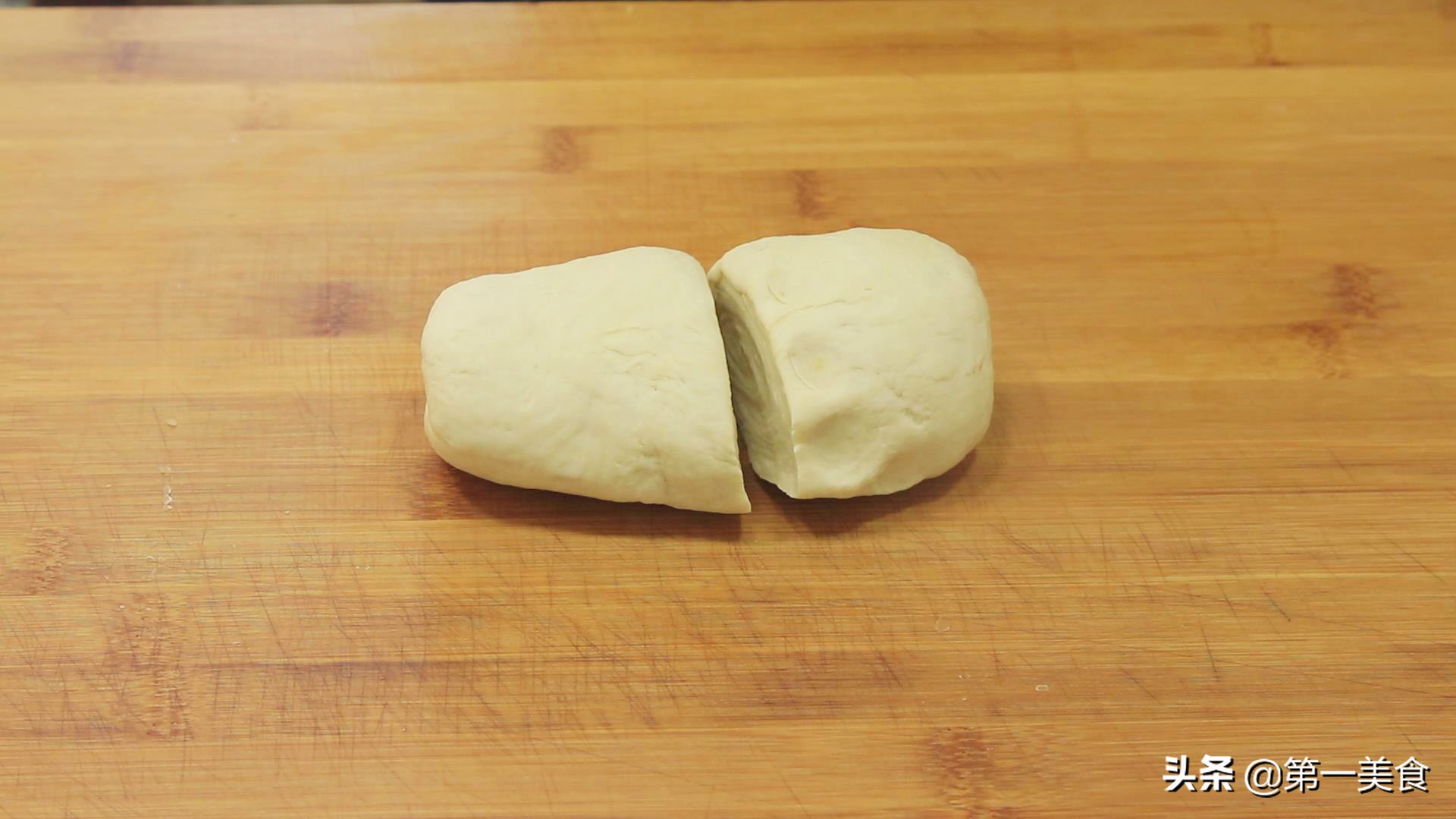 半个小时以后,面团已经醒好了,我们把面团放在案板上面揉搓光滑,用刀把剂子切成两份 按成圆饼状。