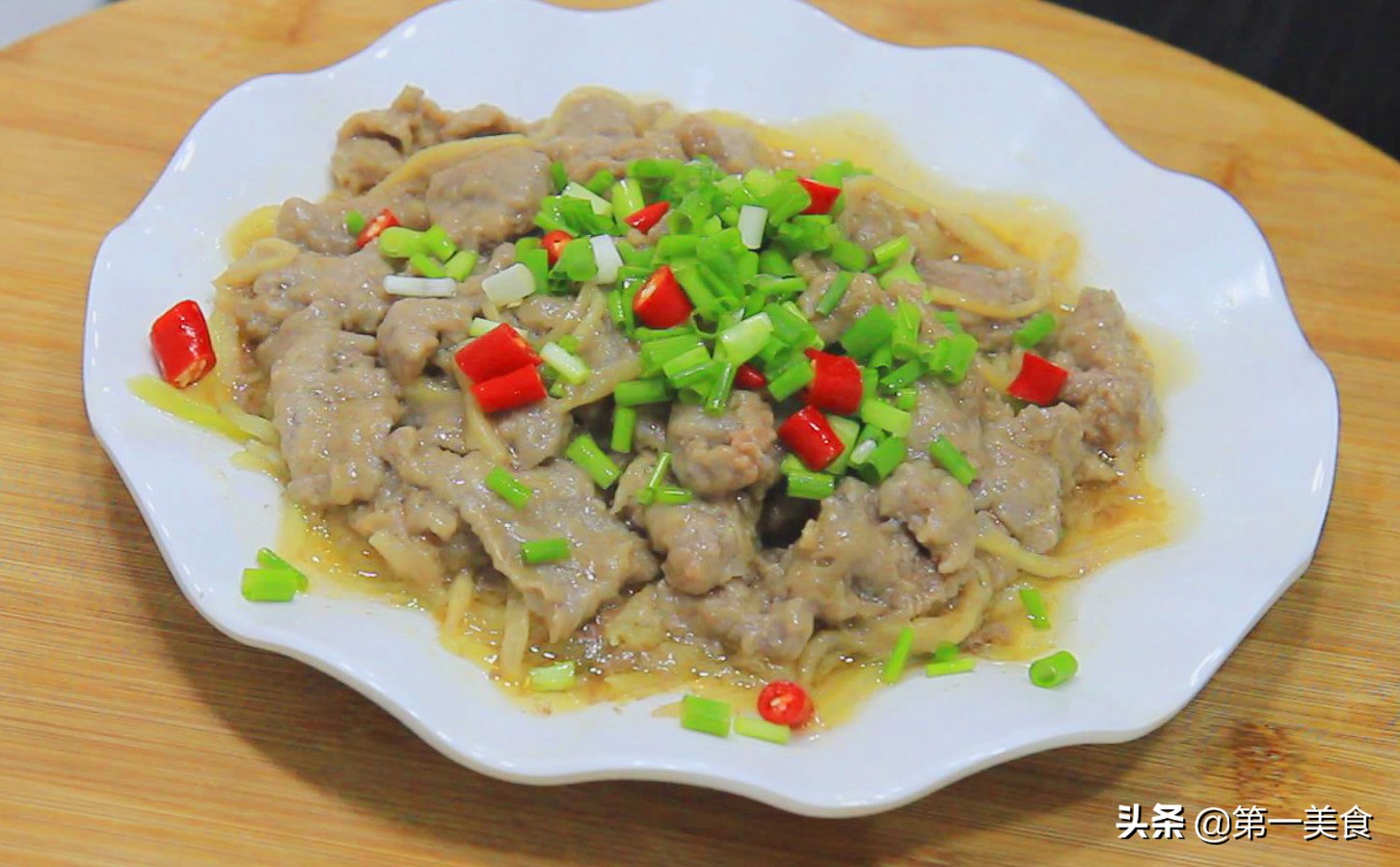 准备生姜一块,先切成薄片,再改刀切成细丝,放在牛肉片上备用。