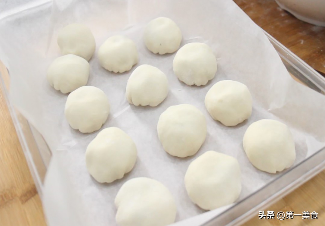 然后把做好的生煎包生坯用保鲜膜盖住,二次发酵5分钟,发酵至生坯微微鼓起即可,这样煎出来的生煎包口感更加松软。