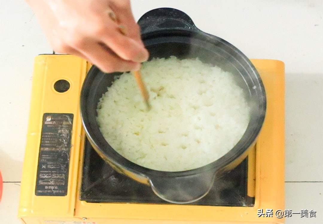 大米浸泡好之后,把表面的杂质淘洗干净,控出水分后,倒入砂锅中,加入适量的清水,水量以没过大米1厘米为宜,盖上锅盖、大火烧开以后,转小火煮10分钟。