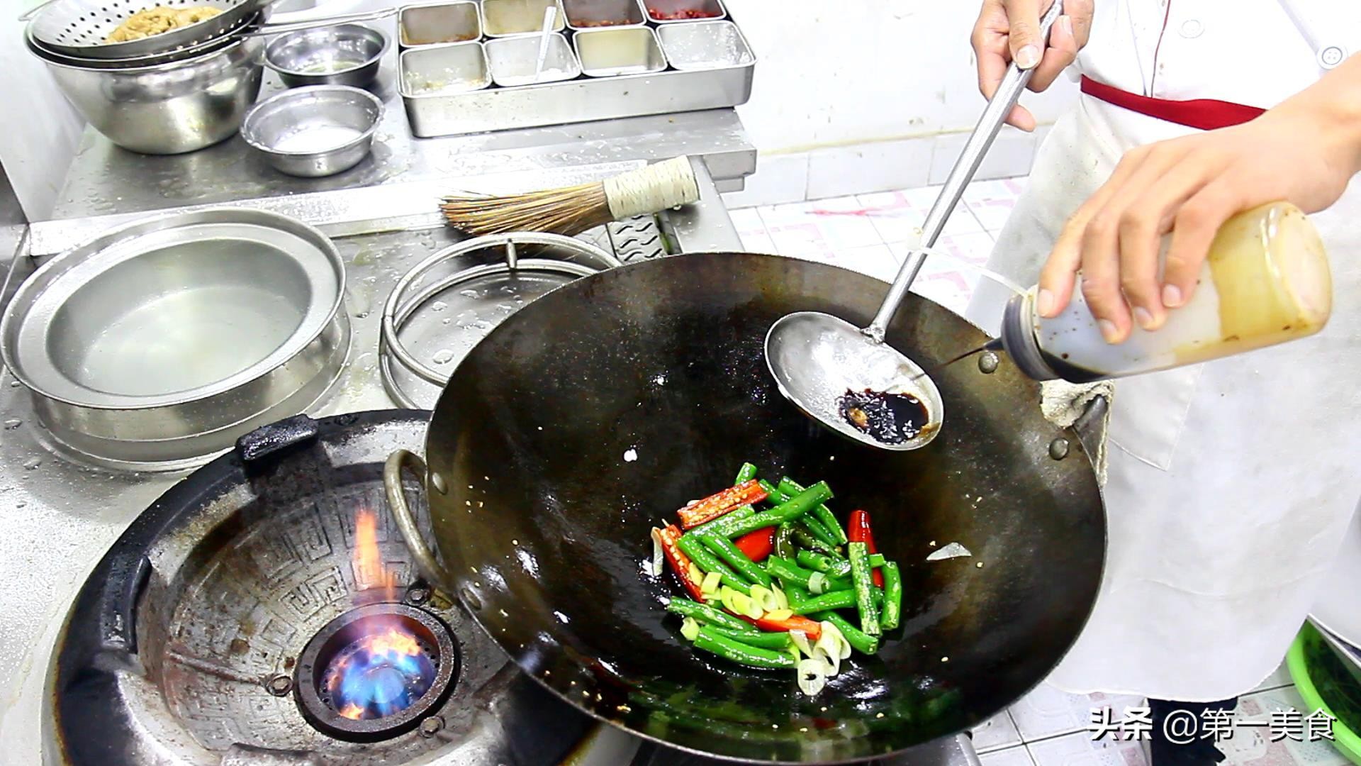 锅内留底油,倒入青、红线椒,开大火翻炒,倒入葱、姜,翻炒出葱香味,加入料酒,从锅边淋入,蚝油增味,生抽增鲜,老抽调色。
