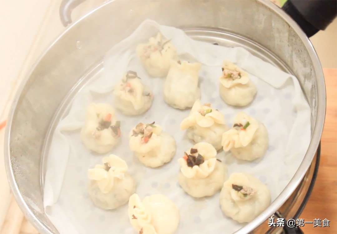 擀好之后,包入适量的馅料,像这样放在虎口处一鞠,把开口挤在一起,最好挤出来一点馅,这样麦烧蒸出来会更加好看。