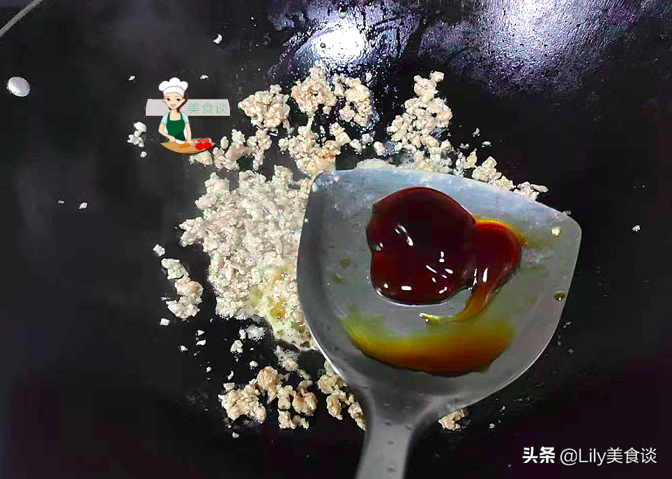 5、加入一勺生抽、一勺蚝油和半勺老抽翻炒均匀。
