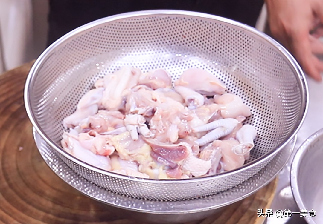 首先,我们准备三黄鸡一个,清洗干净去除鸡屁股、鸡爪上的脚趾,把鸡肉剁成均匀小块,尽量剁的小一点,更加入味。