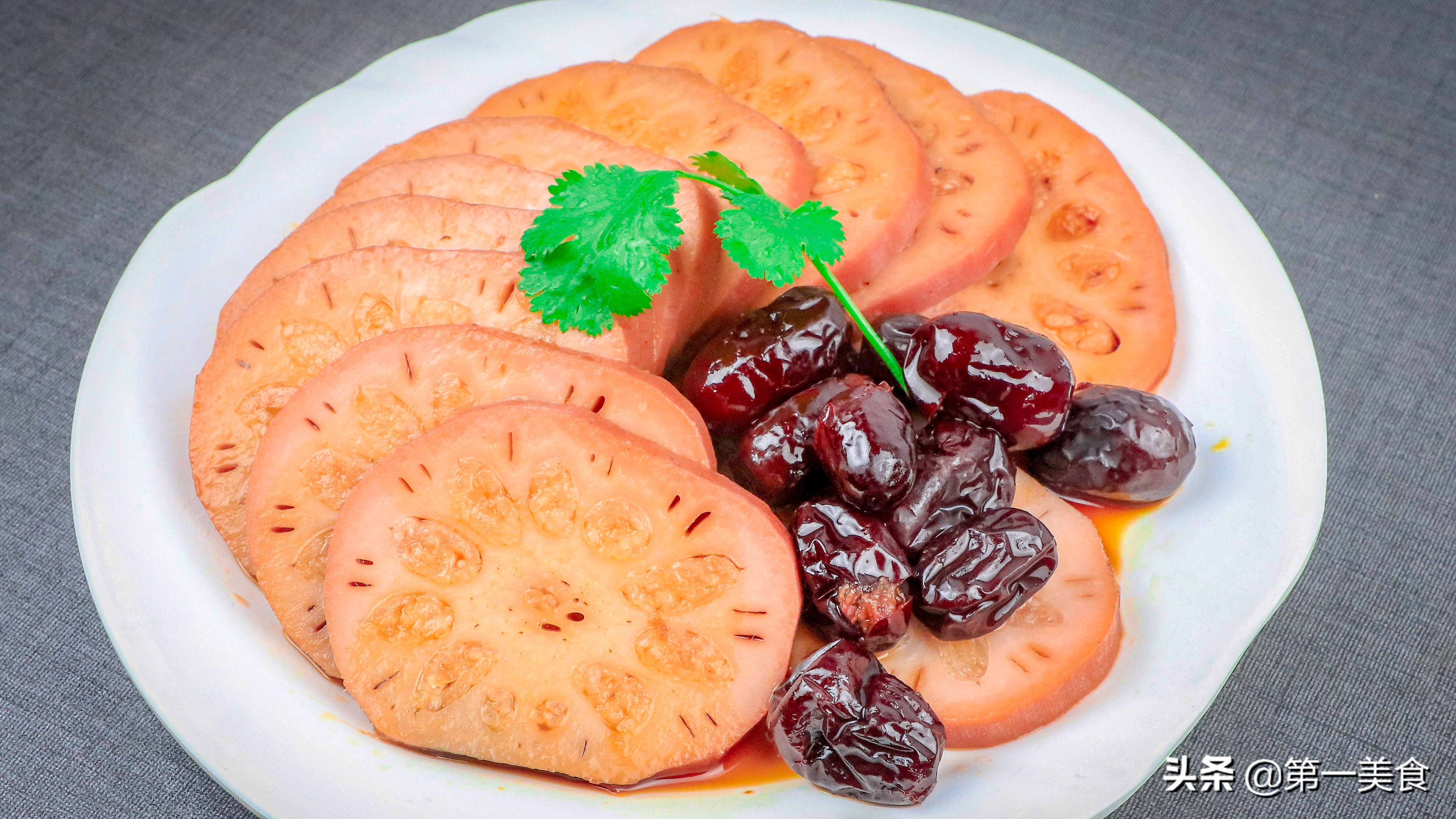 取下牙签,把藕切成片放在盘中,摆放好红枣浇上汤汁,放一根香菜来点缀一下,就可以上桌食用了。