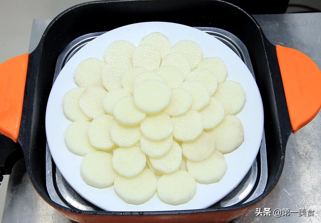 锅中烧水,放上篦子,把山药控干水分进行摆盘,摆好盘以后把山药放入锅中,蒸8分钟就可以了。
