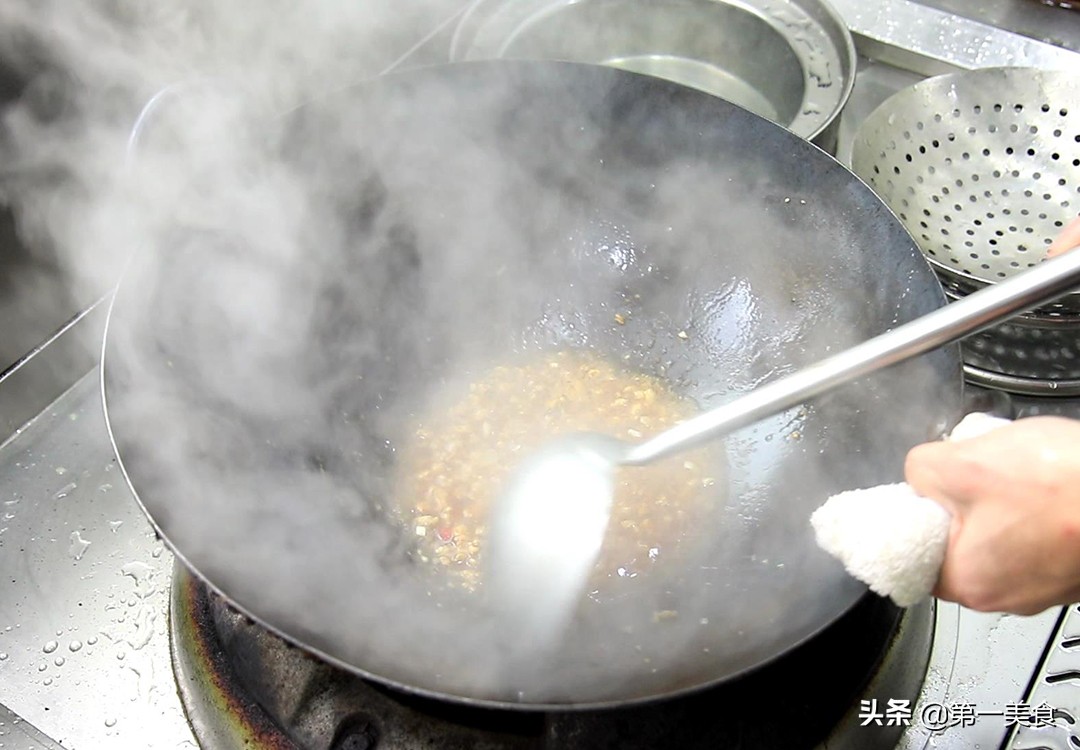 锅内再烧油,充分滑锅以后,倒出热油加入凉油,热锅凉油防止肉末粘锅,把肉末倒进去快速打散,肉末炒白炒香,倒入剩余的葱、姜、蒜末炒出蒜香味。