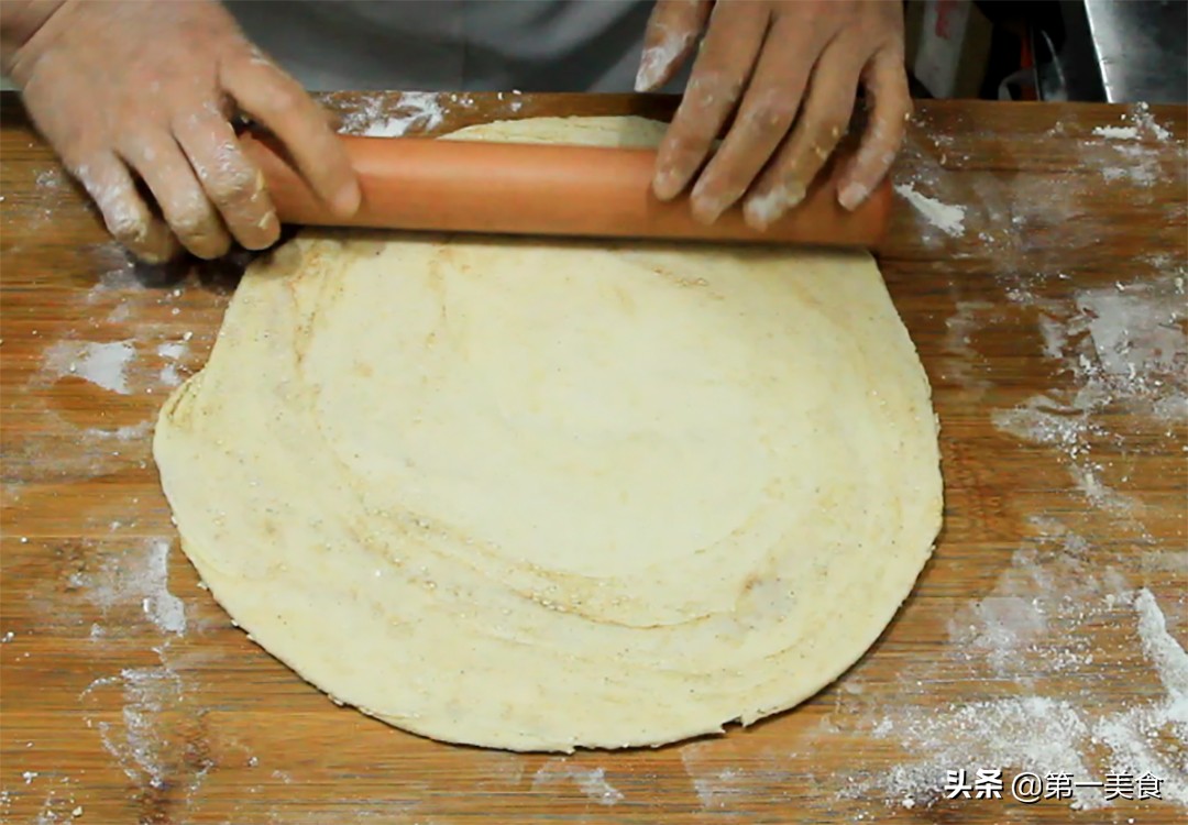 案板上再次撒上干面粉,把生坯摁扁,擀成半厘米厚的圆饼。