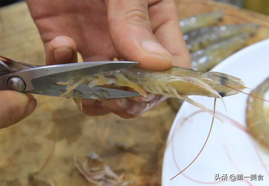 用刀划开虾背,下刀时要偏一点以免划断虾线,而且划开虾背,烹饪的时候更加入味,用牙签挑出虾线,再次把虾洗干净,码放在盘中备用。