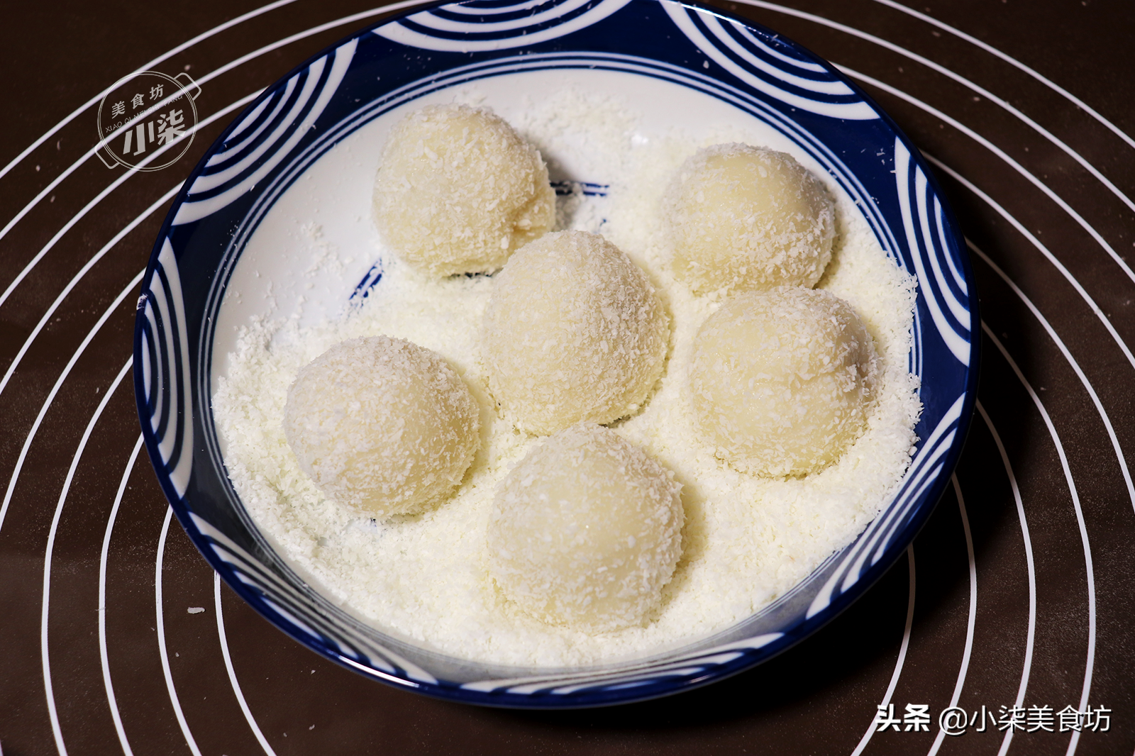 7、团圆后放进椰蓉盘子里,滚上椰蓉,糯米球粘上满满的椰蓉,好吃又不黏。