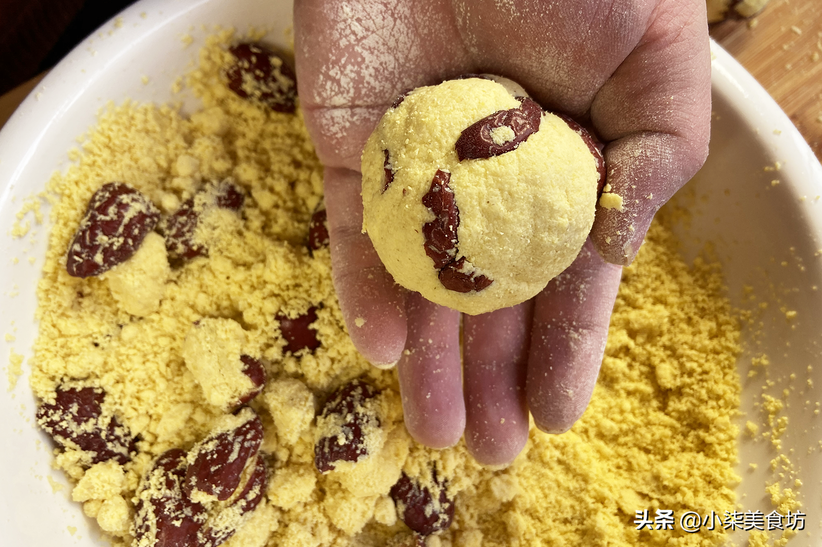 4、再把切好的红枣放进黄米面里,搅拌均匀可以攥成团即可。