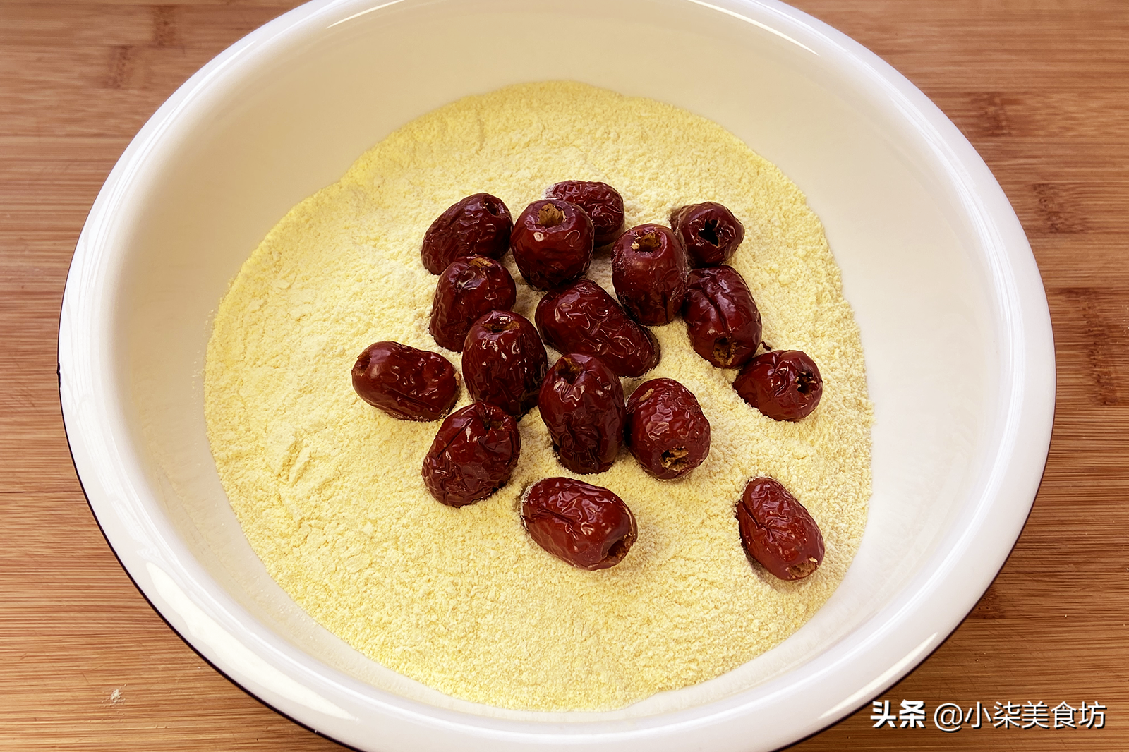2、把黄米面放在盆里,根据自己家人口量来增加黄米面的用量,红枣去核后吃着放心,也不害怕孩子卡嗓子。