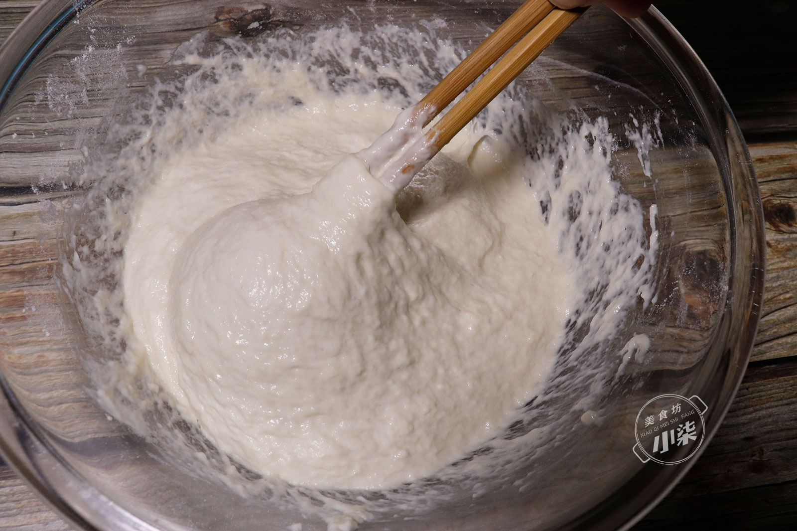第二步:用280克温牛奶和面,分次倒入面粉里,边倒边搅拌,最后搅拌成这种细腻无颗粒的面糊就可以了,盖上保鲜膜醒发至2倍大。