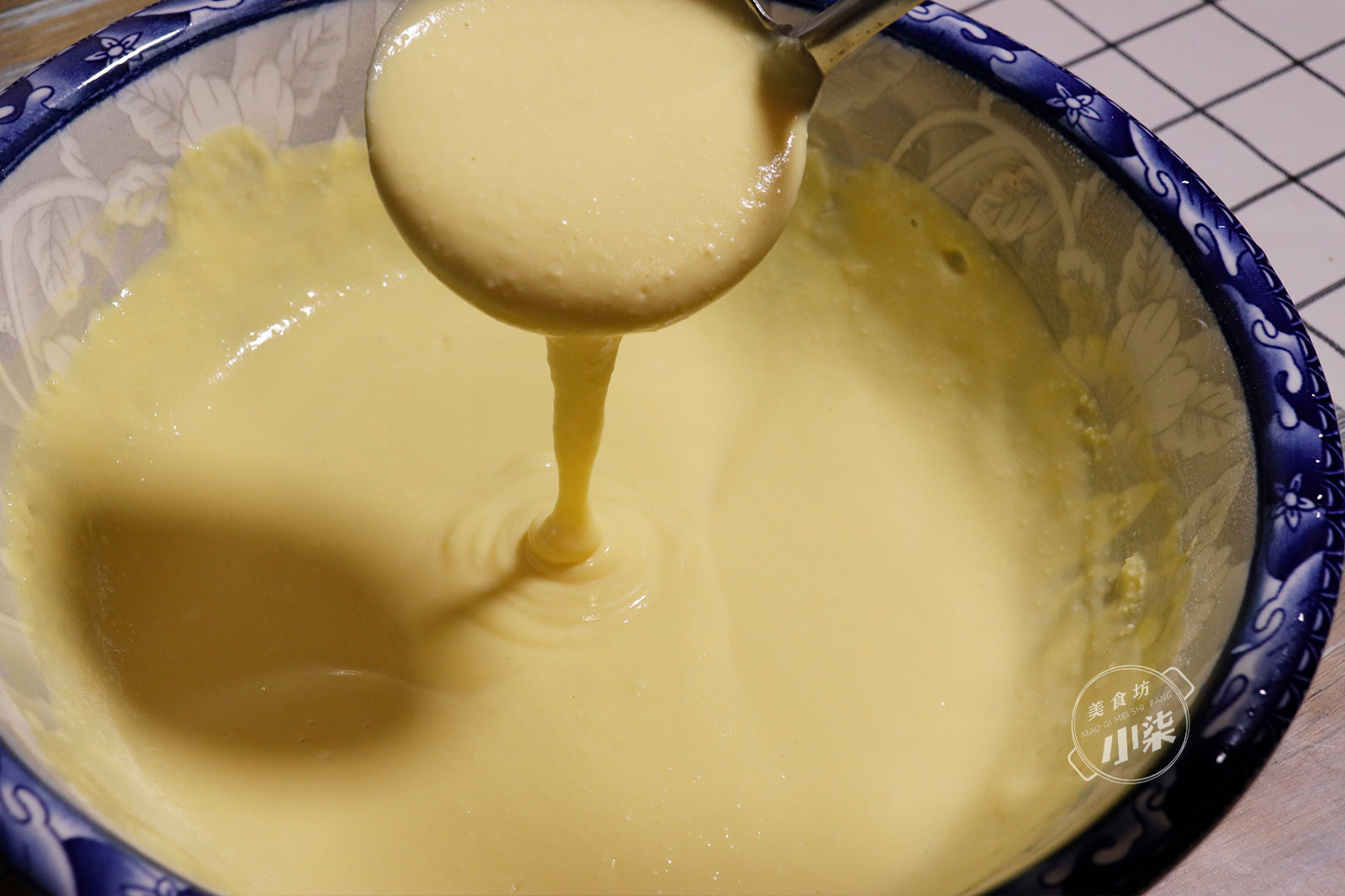 第五步:用勺子搅拌,排出里面的气泡,搅拌至稀糊状,面糊越稀做的饼越软。