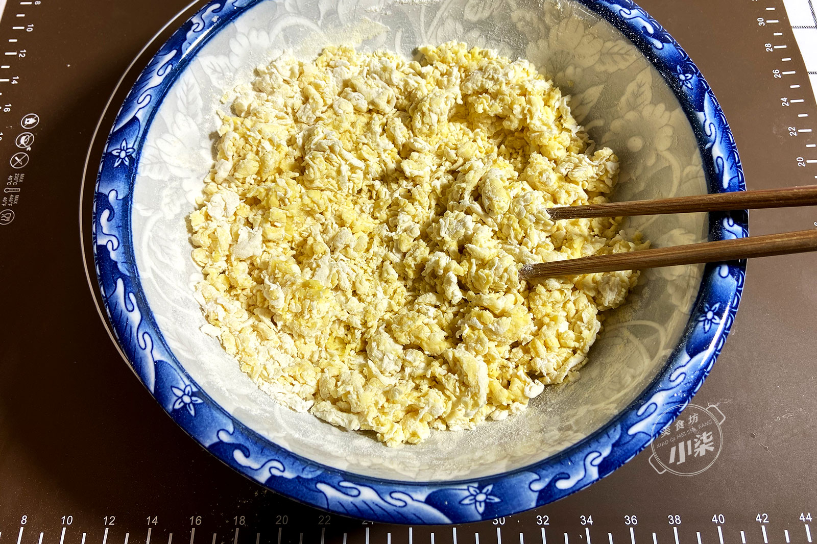 第四步:面粉里加入50克清水,搅拌成面絮状,使面粉和玉米面混合均匀。