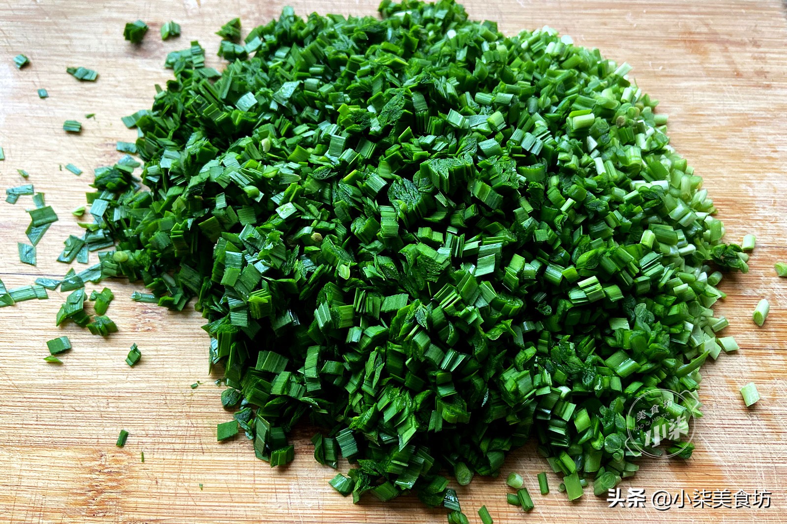 第五步:把控干水分的韭菜切成长段或碎粒,我切的比较碎适合包饺子,做包子馅韭菜切的稍微长一点。