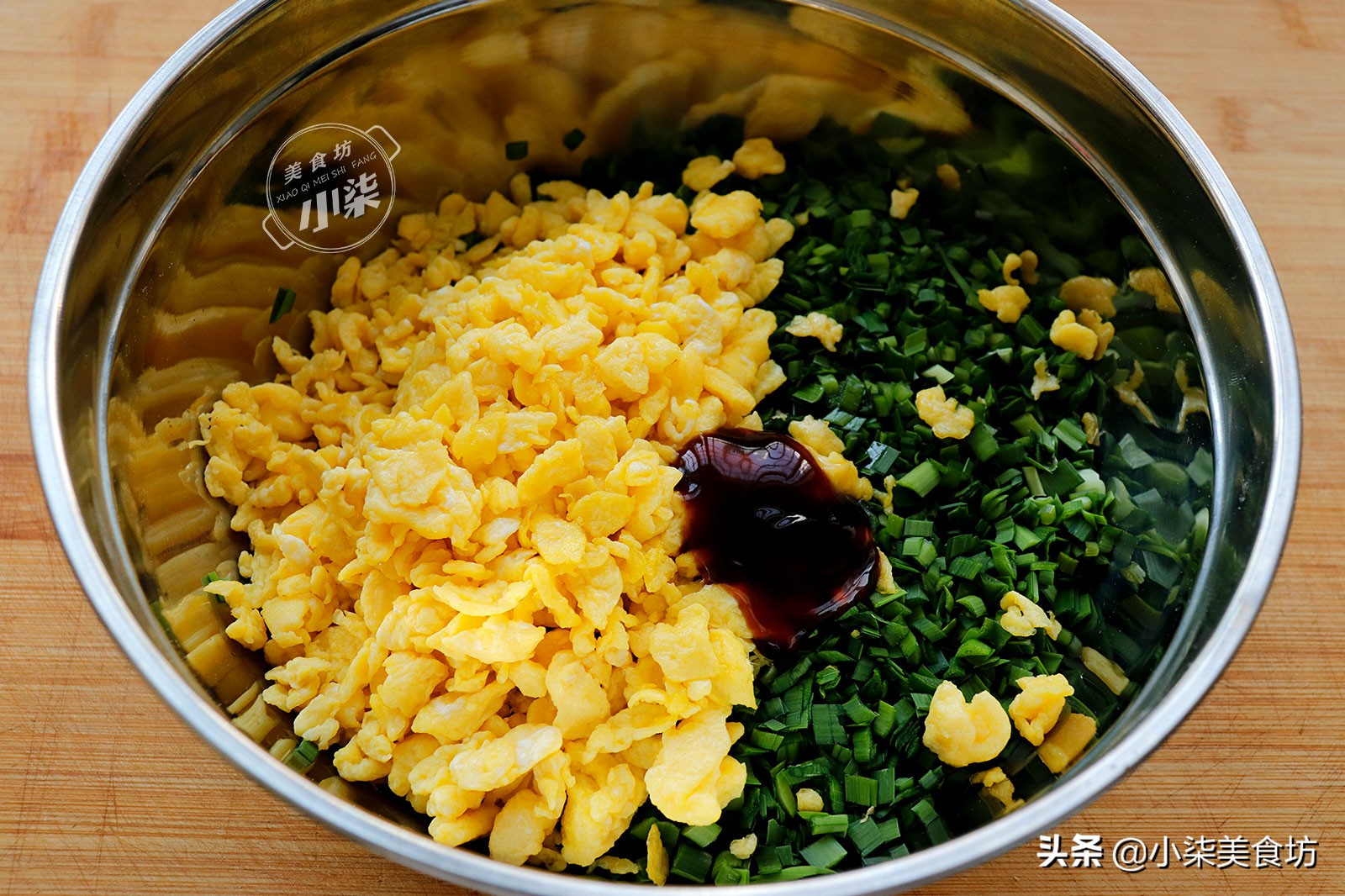 第八步:准备一个盆,把切好的韭菜碎放进盆里,鸡蛋碎晾凉后也放进来,加入一勺蚝油,再加入适量香油,做韭菜馅不需要放太多的调料,否则把韭菜的原味盖住了。