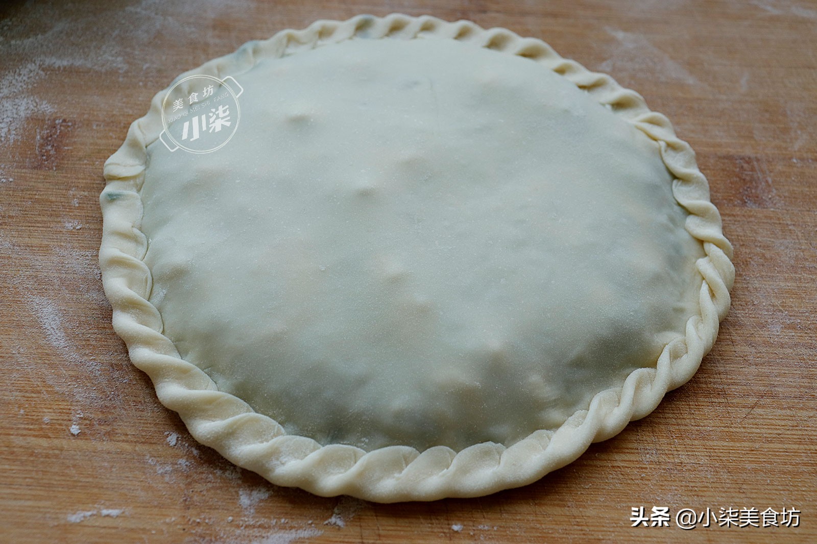 第十三步:再把另一片面饼盖在上面,四边按压紧,边上可以挽成这样的花边。