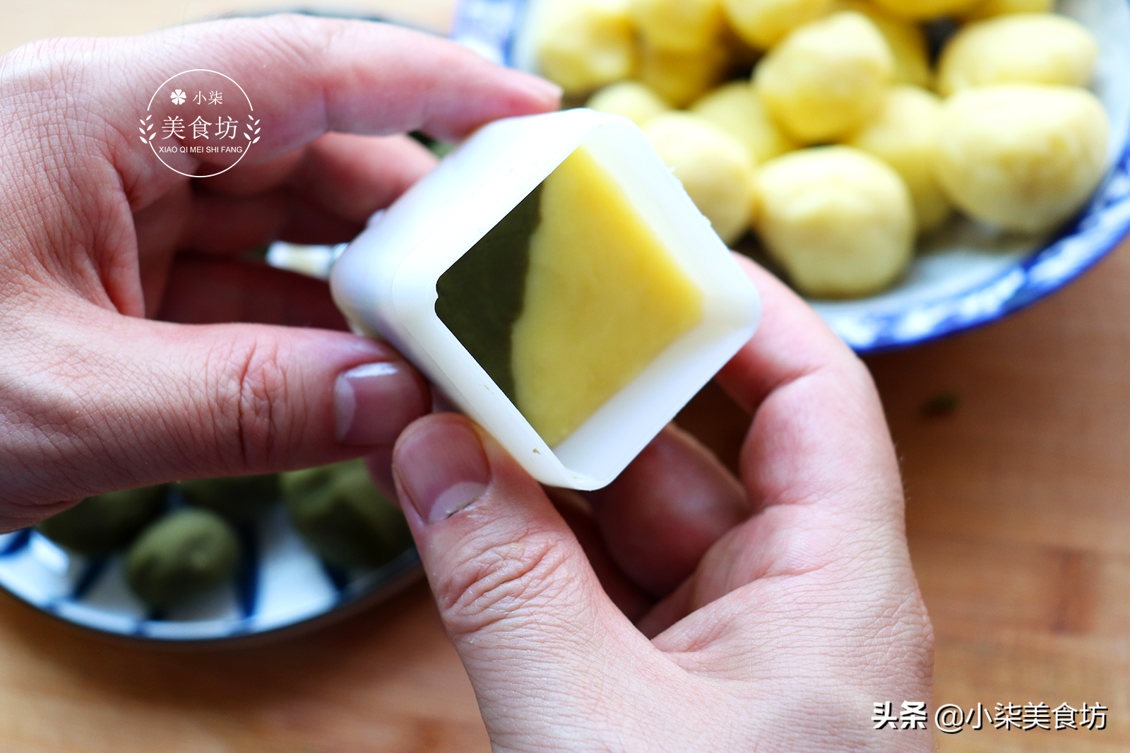 第十二步:我用两种颜色搭配,一半抹茶色,一半原色,放在模具里,用手指按压严实,这样就可以了。