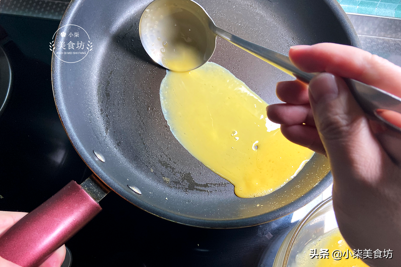 第五步:锅烧至温热,转最小火,倒入蛋液快速转动锅体,锅如果过热倒入的蛋液不容易摊匀,就会充满气孔不平整。