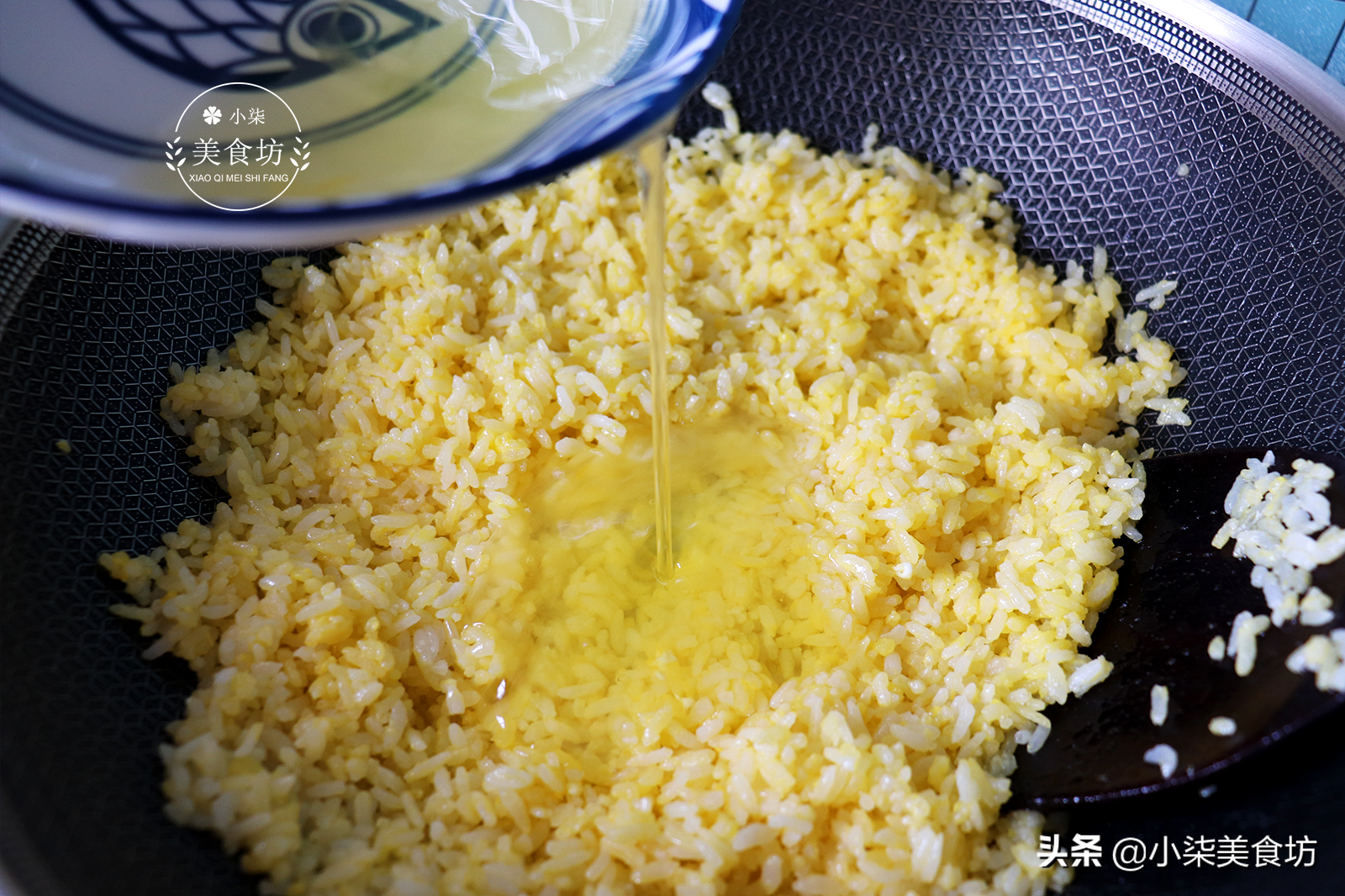 第七步:锅热放入油,油热之后把米饭倒入锅中,先不要翻炒,如果翻炒米饭容易成坨,用铲子压一压滑散,这样滑出来的米饭,它是一粒一粒的,没有大颗粒之后再翻炒均匀,把米饭炒散,这样炒出来的米饭粒粒分明,都是金黄色的。