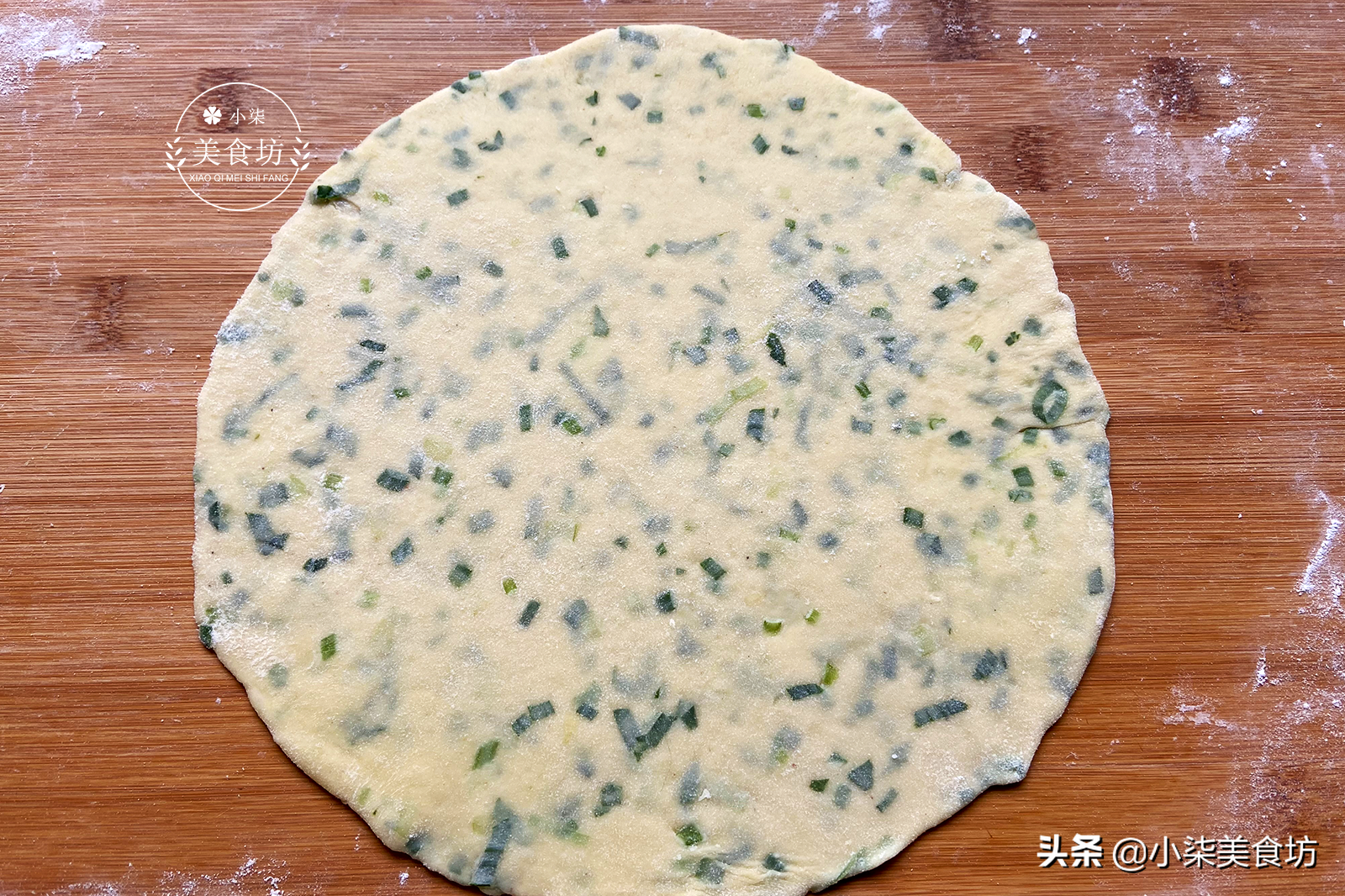 和面的软硬度非常重要,决定烙好的饼口感发干,可能是水加的太少了,还有可能是煎的时间太久或火太大。这个面不需要发酵,用鸡蛋和的面个人感觉特别的松软。葱花放在面粉里一起和,葱花的香味全部容在面的里面,做出的饼更香。
