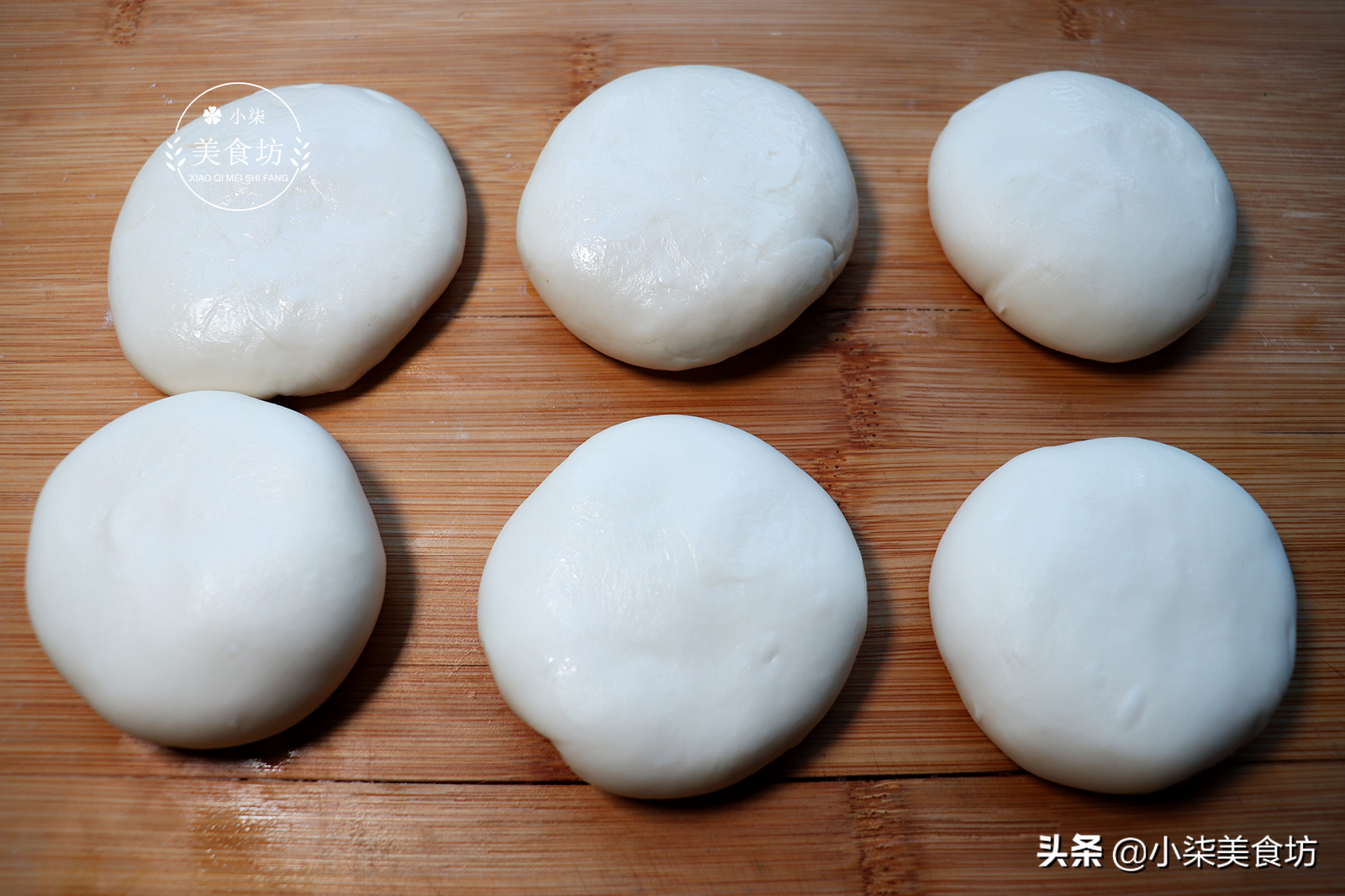 第六步:面团醒好后,取出放案板上,不要揉面,把面团搓成长条,分五到六个小面剂。