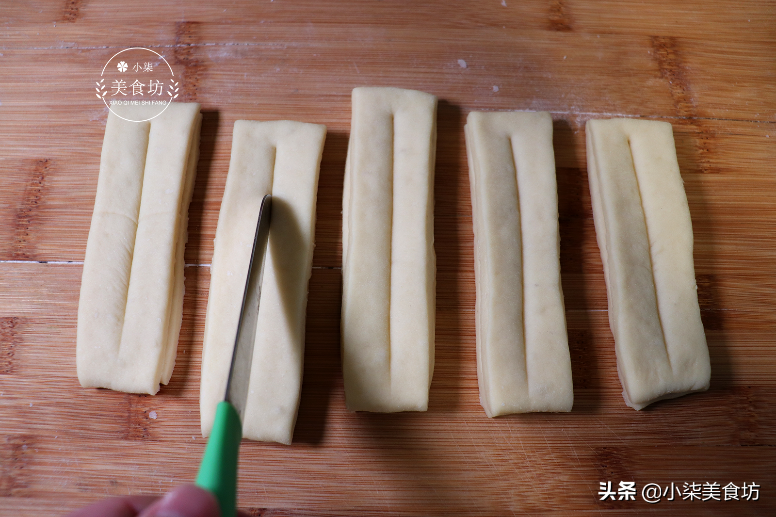 第八步:然后把两个一组摞在一起,用刀子在中间划一个口,两头不要切开。